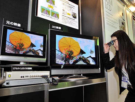 16日,在日本首都東京舉行的日本平板顯示器展上,一名JVC公司的職員展示該公司的實(shí)時(shí)3D立體影像轉(zhuǎn)換系統(tǒng)。畫面左側(cè)為原始圖像,右側(cè)是經(jīng)過轉(zhuǎn)換后的3D立體影像,使用者只需戴上特殊眼鏡便能實(shí)時(shí)看到逼真的立體影像。新華社/法新