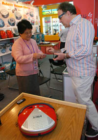 4月16日,一位臺灣參展商(左)在廣交會上介紹智能吸塵器。