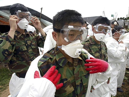 17日,在韓國首都首爾以南215公里處的金堤,士兵穿上防護(hù)服,準(zhǔn)備撲殺感染禽流感的雞。為應(yīng)對四年來最嚴(yán)重的禽流感疫情,韓國已捕殺了300萬只家禽,目前正對7例新的疑似禽流感病例進(jìn)行調(diào)查。新華社/路透