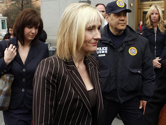 4月14日,在美國紐約,小說《哈利·波特》作者J·K·羅琳(前)向法庭陳述后離開。當(dāng)日,羅琳與一名美國“哈利·波特”迷對簿公堂。羅琳認為,這名“粉絲”打算出版的《哈利·波特詞典》侵犯了她的知識產(chǎn)權(quán)。新華社/路透