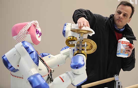 20日,一名參展人員在德國漢諾威的展覽場館內(nèi)擦拭機器人。德國2008漢諾威工業(yè)博覽會于4月21日至25日在這里舉行。來自世界約60個國家和地區(qū)的5100多個參展商將參加這次工業(yè)博覽會。新華社/法新