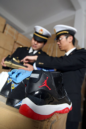 寧波海關(guān)日前對(duì)被控的四個(gè)集裝箱同時(shí)進(jìn)行突擊查驗(yàn),一舉查獲假冒“NIKE”和“飛人喬丹JORDAN(圖形)”商標(biāo)運(yùn)動(dòng)鞋四個(gè)整柜,共計(jì)39360雙,按照正品價(jià)格計(jì)算,貨值約3000萬(wàn)元人民幣。