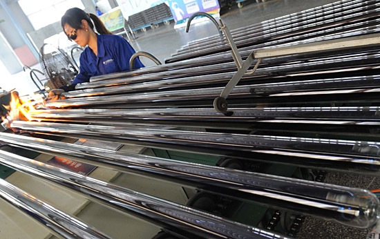 5月7日,工人在加工太陽能全玻璃真空集熱管。 江蘇省太陽雨太陽能有限公司著眼于企業(yè)的創(chuàng)新發(fā)展能力,與國內(nèi)多家大學及科研院所建立合作關系,承擔起多項國家火炬計劃項目,研發(fā)并擁有了100多項擁有自主知識產(chǎn)權的產(chǎn)品。目前該企業(yè)已經(jīng)連續(xù)四年成為中國重要的太陽能熱水器出口制造基地,產(chǎn)品遠銷全球70多個國家和地區(qū)。 | |