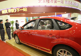 5月15日,在北京春季房展會(huì)展廳,一家參展房地產(chǎn)公司展示“買房送車”的車型。當(dāng)日,2008年北京春季房展會(huì)在北京國(guó)貿(mào)中心開幕,共有100多個(gè)房產(chǎn)項(xiàng)目參展。