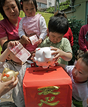 5月15日,天津和平區(qū)保育院的兒童帶著自己的存錢罐,向四川地震災區(qū)捐獻自己的“積蓄”。