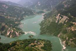 唐家山一帶受阻河道水面上升較快。由于水量過(guò)大,一旦堤壩坍塌會(huì)對(duì)下游構(gòu)成極大威脅。新華社記者:王建民 攝