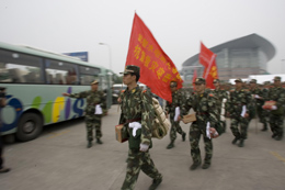 5月25日,武警水電部隊(duì)官兵在綿陽(yáng)機(jī)場(chǎng)的營(yíng)地,準(zhǔn)備上車(chē)駛往唐家山堰塞湖方向。新華社記者:朱煒 攝