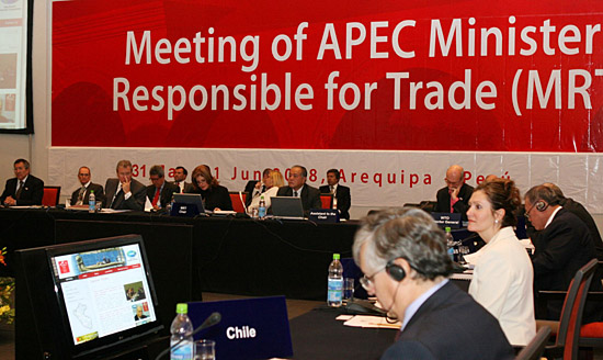 5月31日,第14屆亞太經(jīng)濟合作組織貿(mào)易部長會議在秘魯南部阿雷基帕省首府阿雷基帕開幕。亞太經(jīng)合組織21個經(jīng)濟體的貿(mào)易部長或其他高級官員以及世界貿(mào)易組織的代表共200多人出席了會議。由商務部部長陳德銘率領的中國代表團也出席了會議。新華社發(fā)