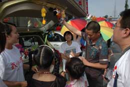 5月31日,人們在臺州的“汽車后備箱市場”選購物品。當日,浙江臺州的200多輛私家車聚集在當?shù)匾惶帍V場參加“汽車后備箱市場”活動。車主們以后備箱為“攤位”,擺放汽車配飾、生活用品等供人選購。全部義賣所得和其他募集的善款將捐獻地震災區(qū),用于援建一所愛心學校。