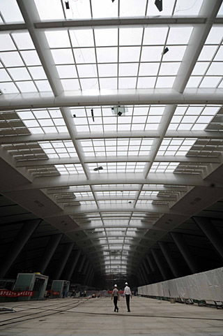 北京南站日前進入工程收尾階段,預(yù)計于6月30日竣工,7月中旬完成系統(tǒng)調(diào)試,8月1日正式開通運營。新南站總建筑面積42萬平方米,是集鐵路、地鐵、公交等于一體的大型綜合交通樞紐。它將成為城際列車和客運專線等快速列車在北京到發(fā)的客運站。圖為北京南站候車室。