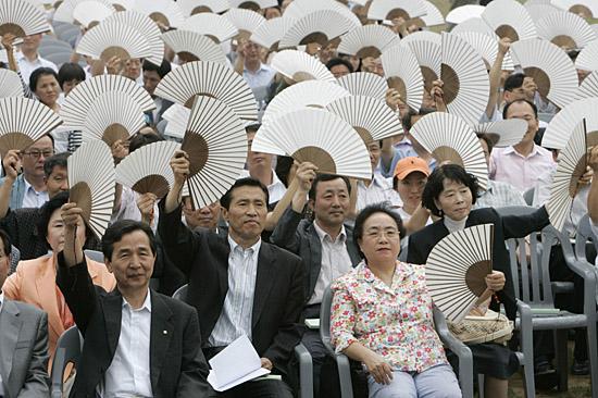 19日,在韓國(guó)首都首爾的市政廳大廈,人們手舉紙制扇子,表示對(duì)節(jié)能運(yùn)動(dòng)的支持。新華社/路透