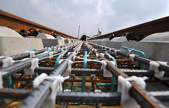 6月19日,施工人員在武廣客運專線調(diào)試試驗鐵路枕軌。 武(漢)廣(州)客運專線是中國鐵路建設(shè)史上新的里程碑工程,也是國家“十一五”規(guī)劃重點工程。武廣客運專線2005年開工,設(shè)計時速為350公里,它將連接湖北、湖南、廣東三省,是華中、華南的又一重要通道。作為當(dāng)時我國開工建設(shè)第一條里程最長、投資最多、技術(shù)標(biāo)準最高的鐵路客運專線,武廣客運專線主要應(yīng)用了板式和雙塊式無砟軌道,具有技術(shù)新、標(biāo)準高、工程龐大、系統(tǒng)復(fù)雜等特點。 | |