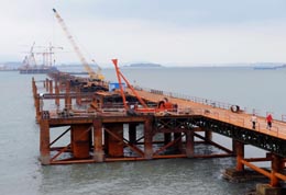 全面貫通的福建省平潭海峽大橋施工棧橋。福建平潭海峽大橋自2007年11月開工建設(shè)以來,經(jīng)過600多名建設(shè)者日夜奮戰(zhàn),大橋施工用棧橋于近日全線貫通,進(jìn)入主橋橋墩海底施工階段,這標(biāo)志著大橋主體施工進(jìn)入快車道。總投資為11億多元,建設(shè)工期3年的平潭海峽大橋地處福建東部,連接內(nèi)陸福清市與福建第一大島嶼——平潭島,大橋全長3500米,設(shè)計(jì)為雙向4車道,是進(jìn)出平潭島的最便捷通道。 |