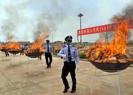 6月24日,幾位警察點燃將被銷毀的毒品。當日,昆明鐵路公安局在“6·26”國際禁毒日前夕公開銷毀150余公斤毒品,包括海洛因、冰毒、鴉片、搖頭丸等。