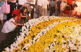 6月24日,圖片展入口處堆滿了觀展的市民獻(xiàn)上的菊花。6月19日在上海展覽中心開幕的“抗震救災(zāi) 眾志成城——2008中國抗震救災(zāi)大型新聞圖片巡回展”吸引了眾多申城市民前往參觀。截至6月24日16時(shí),觀眾總數(shù)已達(dá)到11.5萬人。