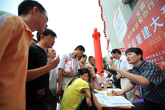 [進(jìn)入汶川地震專題] 6月29日,一家用工單位的工作人員(右)在向受災(zāi)群眾介紹單位情況。當(dāng)日,中華全國總工會(huì)開展的“全國工會(huì)就業(yè)幫扶愛心行動(dòng)”在四川綿陽市惠民幫扶中心正式啟動(dòng),來自天津、江蘇、浙江、福建、廣東5個(gè)省市的工會(huì)和近800家企業(yè)為四川災(zāi)區(qū)帶去8萬多條崗位信息。 | |