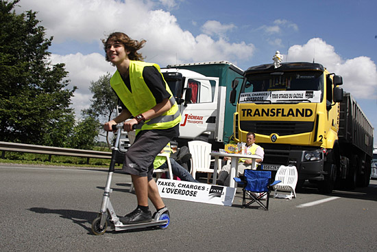 6月30日,在法國北部的法朗潘,一名少年蹬著滑板車從堵塞公路的卡車旁經(jīng)過。當(dāng)天,法國大批卡車司機(jī)在法國多個城市以堵塞道路的方式抗議油價(jià)上漲,并要求政府支持運(yùn)輸行業(yè)。新華社/路透