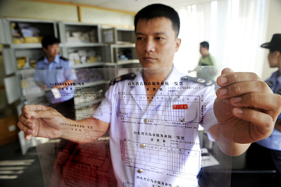 6月29日,國(guó)稅稽查隊(duì)員在介紹用于制造假發(fā)票的菲林片。近日,由青島市國(guó)稅稽查局、公安局聯(lián)合查辦的“4·16”特大制售假發(fā)票團(tuán)伙案結(jié)案,共搗毀假發(fā)票地下印刷工廠一個(gè),繳獲制造假發(fā)票專業(yè)生產(chǎn)線一條,打掉制售假發(fā)票團(tuán)伙三個(gè),抓獲涉案人員30余人,繳獲各類假發(fā)票共計(jì)45萬(wàn)余份,涉案金額120余億元。