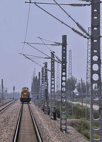 7月7日,中鐵電氣化局一公司的架線施工車輛在為改造的電氣化鐵路架線。當日,我國北方運煤通道大包電氣化鐵路全面開展接觸網(wǎng)架設施工,標志著這一重要工程進入最后關鍵階段。大包電氣化鐵路為內蒙古首條國有電氣化鐵路,起始于山西大同市,終至內蒙古包頭市,全長450公里,是西北、華北、東北地區(qū)客貨運輸?shù)闹匾獦屑~。