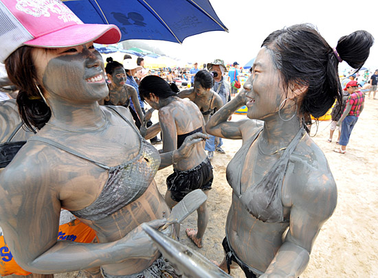 在韓國保寧大川海水浴場舉行的泥漿節(jié)上,游客們在泥漿中嬉戲。保寧每年舉行泥漿節(jié)吸引游客,游客可以將泥漿涂抹在身上美容護膚。新華社/法新