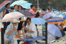7月24日中午,在北京奧林匹克中心區(qū)奧運(yùn)門(mén)票售票點(diǎn),市民們冒著酷暑排隊(duì)等候購(gòu)買奧運(yùn)門(mén)票。 北京奧運(yùn)會(huì)最后82萬(wàn)余張比賽門(mén)票將于7月25日起通過(guò)設(shè)在各奧運(yùn)場(chǎng)館的售票亭面向公眾發(fā)售,其中有25萬(wàn)張是北京地區(qū)的比賽門(mén)票,其余均為在上海、天津、沈陽(yáng)、秦皇島舉行的足球比賽門(mén)票。為買到門(mén)票,部分市民從23日中午就開(kāi)始在奧運(yùn)門(mén)票售票點(diǎn)排隊(duì)等候。 |