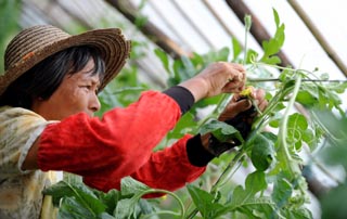 7月31日,廣西岑溪市馬路鎮(zhèn)馬路社區(qū)農(nóng)民羅富芬在“三避”技術(shù)示范基地給西瓜授粉。從2005年起,廣西先后投入1400萬元大力推廣“三避”(避雨、避寒、避曬)技術(shù),建成“三避”技術(shù)示范基地520多個、面積426萬畝,培訓農(nóng)民360萬人次,并在試驗與示范的基礎(chǔ)上,摸索出“三避”技術(shù)栽培模式30類,涉及瓜菜、水果、水稻等作物100多種。3年來,全區(qū)依靠“三避”技術(shù),實現(xiàn)新增農(nóng)業(yè)效益83億元。 |