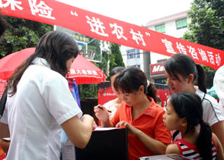 2008年6月27日,福建省一些保險公司的工作人員正在向閩清縣白樟鎮(zhèn)的居民介紹保險知識。當(dāng)日,福建保監(jiān)局、福建省保險學(xué)會、福建省保險行業(yè)協(xié)會及9家保險公司共120多人在白樟鎮(zhèn)開展了“保險進農(nóng)村”宣傳活動。新華社記者:康淼