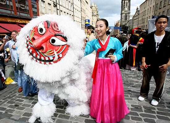 2日,在英國蘇格蘭首府愛丁堡,韓國演員與韓國舞獅演員在街頭向游客介紹即將在愛丁堡邊緣藝術節(jié)上演出的歌舞節(jié)目。今年的愛丁堡邊緣藝術節(jié)于3日正式拉開帷幕,一直持續(xù)到25日,藝術節(jié)上獨具東方特色的文化和藝術吸引了眾多關注。這一藝術節(jié)是世界上規(guī)模最大的開放性藝術活動之一。
