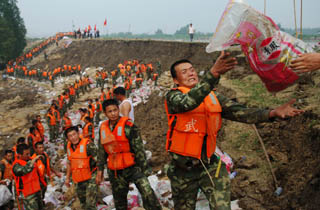 8月4日,數(shù)百名解放軍和武警官兵在加固大堤。7月31日以來的強(qiáng)降雨致使安徽滁河、得勝河、清溪河等長江支流出現(xiàn)超保證水位的嚴(yán)峻汛情。8月3日,滁河大公莊段發(fā)生100余米塌方,威脅堤內(nèi)數(shù)萬名群眾的生命財產(chǎn)安全。接到命令后,南京軍區(qū)某部和武警蚌埠支隊,迅速調(diào)集2500多名官兵除險加固大堤。廣大官兵冒著高溫,連續(xù)奮戰(zhàn)。截至記者發(fā)稿時,大堤加固已取得階段性成功,險情得到基本控制。 |