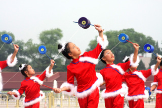 8月5日,北京市四季青小學的學生在表演抖空竹。當日,來自北京及全國各地的民俗節(jié)目在天安門廣場集中展示,精彩紛呈的表演吸引許多中外游客駐足觀賞。