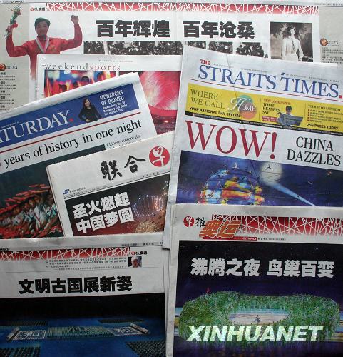 8月9日出版的新加坡《聯(lián)合早報(bào)》、《海峽時(shí)報(bào)》和《今日?qǐng)?bào)》以大幅照片和通欄標(biāo)題報(bào)道北京奧運(yùn)會(huì)開(kāi)幕式,盛贊北京奧運(yùn)會(huì)開(kāi)幕式“光彩照人”。