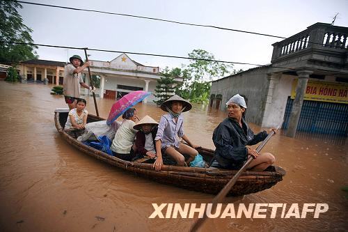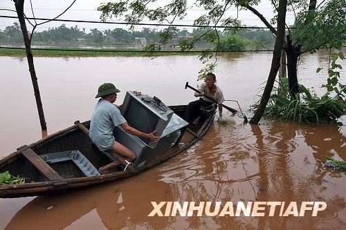 8月9日,在越南富壽省的夏和地區(qū),當(dāng)?shù)孛癖姵俗〈x開被洪水淹沒的村莊。新華社/法新