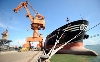8月13日,一艘外籍貨輪停靠欽州港勒溝作業(yè)區(qū)卸貨。據(jù)南寧海關(guān)統(tǒng)計(jì),2008年上半年廣西北部灣經(jīng)濟(jì)區(qū)進(jìn)出口29.9億美元,同比增長(zhǎng)83.3%。防城港、南寧、欽州三市分別以12億美元、8.7億美元、6.2億美元位列經(jīng)濟(jì)區(qū)進(jìn)出口前三,其中欽州增速最快,達(dá)1.2倍。 |