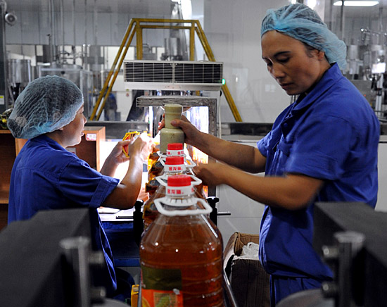近年來(lái),隨著以進(jìn)口大豆為原料的加工企業(yè)的陸續(xù)落戶,北部灣已成為國(guó)內(nèi)大豆加工新基地。目前,分布在廣西沿海的大豆加工數(shù)量約占全國(guó)比例的15%。圖為廣西防城港市“大海糧油”的員工在生產(chǎn)食用油。