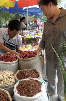 8月31日,一位市民在烏魯木齊市安寧渠鎮(zhèn)購買佐料。 受成本拉動影響,烏魯木齊市民鐘愛的馕、拌面、抓飯等“快餐”單價近期上漲了30%左右。為防止居民生活受到影響,當(dāng)?shù)卣扇×硕囗棿胧,控制食品價格過快上漲。據(jù)了解,烏魯木齊市政府嚴(yán)格執(zhí)行國家糧食收購價格,保證國庫糧食儲備。同時,市政府按照國家標(biāo)準(zhǔn)足額發(fā)放糧食農(nóng)資綜合直補金,激發(fā)了農(nóng)民種糧積極性,確保糧食種植面積,從而控制糧食價格上漲。此外,市政府嚴(yán)厲打擊囤積糧食、哄抬物價的不法經(jīng)營行為。
