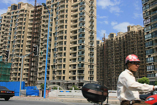 一位上海市民騎車從上海中心城區(qū)某新建商品樓前經(jīng)過(9月9日攝)。上海佑威房地產(chǎn)研究中心9月10日發(fā)布的最新報(bào)告顯示,2008年上海樓市調(diào)整過程中,已有44.8%的新樓盤平均成交價(jià)格出現(xiàn)下跌。