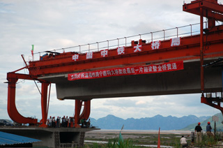 9月15日,由中鐵大橋局承建的溫福鐵路寧德特大橋的最后一片預(yù)制箱梁正在架設(shè)中。 當(dāng)日,全長(zhǎng)約8169米的跨海鐵路大橋——溫福鐵路寧德特大橋順利貫通,為溫福鐵路按期鋪軌創(chuàng)造了條件。溫福鐵路寧德特大橋于2005年9月開(kāi)建,有5000多米長(zhǎng)的橋梁跨海,建設(shè)難度大。溫福鐵路是我國(guó)鐵路中長(zhǎng)期規(guī)劃“八縱八橫”主通道沿?焖勹F路的重要組成部分,與福(州)廈(門)和廈(門)深(圳)兩條沿?焖勹F路相連后,將成為從長(zhǎng)三角經(jīng)福建到珠三角的最便捷通道。 |