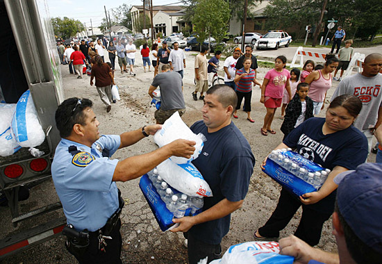 15日,在美國休斯敦,一名警察將冰塊和水發(fā)放給當(dāng)?shù)貫?zāi)民!鞍恕憋Z風(fēng)15日過后,美國得克薩斯州等受災(zāi)地區(qū)正在開展救援行動,但這些地區(qū)目前尚無法恢復(fù)正常生活和生產(chǎn)。新華社/路透