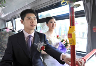 9月22日,杭州一對(duì)新人搭乘由公交車稍加裝飾而成的“婚車”出行。當(dāng)日是“國(guó)際無(wú)車日”,杭州一對(duì)新人臨時(shí)決定包租一輛環(huán)保型公交車作為婚車,表達(dá)對(duì)“無(wú)車日”活動(dòng)的支持。