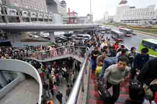 10月5日,旅客走過北京西站邊的一座天橋。當(dāng)日是國(guó)慶長(zhǎng)假最后一天,北京迎來返城客流高峰。