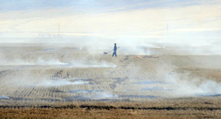10月6日,青海門源縣一位農(nóng)民在田里焚燒秸稈。深秋時節(jié),在青海省門源回族自治縣的數(shù)十萬畝油菜種植區(qū),當(dāng)?shù)匾恍┺r(nóng)民在田里焚燒秸稈,產(chǎn)生大量煙霧,不僅污染環(huán)境,而且影響周邊道路安全。