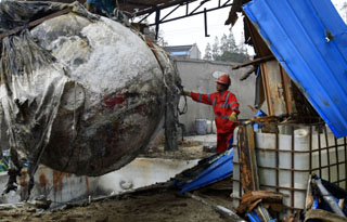 10月7日中午,上海奉賢區(qū)金匯鎮(zhèn)發(fā)生一起廢棄三氯化磷儲(chǔ)罐泄漏事故,造成周邊一些群眾氯化氫中毒。目前,污染源已徹底清除,空氣質(zhì)量達(dá)標(biāo),無(wú)危重病人,部分受傷群眾已康復(fù)出院。圖為10月8日,環(huán)保人員對(duì)發(fā)生泄漏的儲(chǔ)罐進(jìn)行調(diào)離處置。