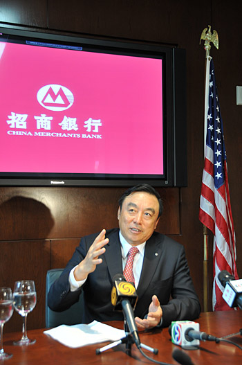 。ㄗ髨D為10月8日,招商銀行行長馬蔚華在招行紐約分行開業(yè)儀式上發(fā)表講話。)新華社記者 陳剛 攝