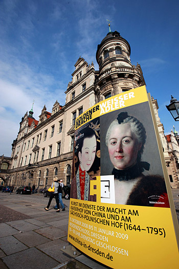 10日,《金龍與白鷹》中德宮廷藏品展的宣傳海報豎立在德國東部城市德累斯頓王宮前。當天,《金龍與白鷹》中德宮廷藏品展向媒體開放,本次展覽為期3個月,是今年德累斯頓“中國年”的壓軸節(jié)目。展覽展出了中國清朝皇宮和德國薩克森選帝侯王宮收藏的繪畫和工藝珍品約400件,由德國德累斯頓國家藝術館和中國故宮博物院共同主辦。雙方提供的展品包括繪畫、瓷器、宮廷家具等,以相互比較的方式同室展出。