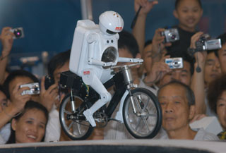 10月12日,在深圳舉辦的第十屆中國(guó)國(guó)際高新技術(shù)成果交易會(huì)上,機(jī)器人表演騎自行車通過呈“S”形狀的木板。這個(gè)由日本參展商帶來的騎車機(jī)器人裝有超聲波傳感器、陀螺儀傳感器和震動(dòng)傳感器,感知到的信息可從傳感器傳到電腦,由電腦通過信息處理和傳輸來控制機(jī)器人騎車的速度和方向等。