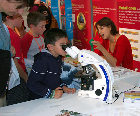 12日,在奧地利首都維也納市政廳廣場(chǎng)舉行的科普日活動(dòng)上,一名兒童通過顯微鏡觀察微觀世界。維也納市政府利用周末在市政廳廣場(chǎng)舉行科普日活動(dòng),圖片、模型、電腦演示和實(shí)際操作等豐富內(nèi)容吸引了大批市民前來參觀。