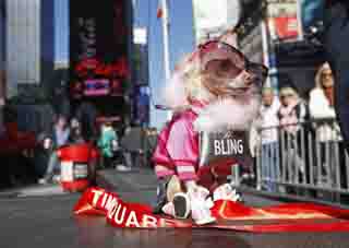 19日,在美國紐約時報廣場舉行的犬類化妝大賽上,奇瓦瓦狗“花生”憑借百老匯音樂劇《律政俏佳人》的主角艾兒·伍茲的裝束獲得本屆化妝大賽冠軍。