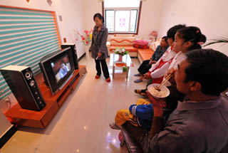 11月6日,安徽省肥西縣三河鎮(zhèn)木蘭村農(nóng)民羅以福一家和鄰居在一起收看電視。 隨著經(jīng)濟(jì)的發(fā)展和農(nóng)村電氣化改造的實(shí)施,木蘭村率先引用了預(yù)付費(fèi)電表及控制裝置,更新了電壓穩(wěn)定和損耗小的新型變壓器,幾乎每家每戶都購(gòu)置了冰箱、空調(diào)等電器,成為電氣化建設(shè)示范先進(jìn)村。