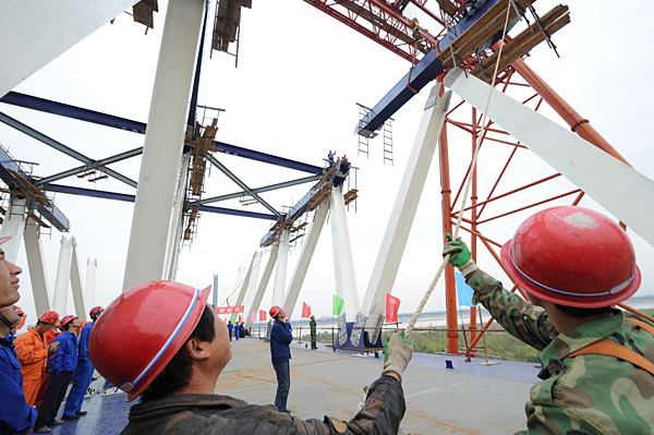 11月6日,中鐵大橋局的建設(shè)者在鄭州黃河公路鐵路兩用橋上架設(shè)鋼梁。當(dāng)日,鄭州黃河公路鐵路兩用橋開始架設(shè)鋼梁,這標(biāo)志著大橋工程的控制性節(jié)點工作全面展開。鄭州黃河公路鐵路兩用橋是京廣客運專線和公路大橋跨越黃河的共用橋梁,公路鐵路采用上下兩層分布,合建部分全長9177米,工程將于2010年7月完工。