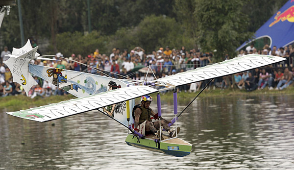 9日,在墨西哥首都墨西哥城,一名選手乘坐飛行器參加比賽。墨西哥城當(dāng)日舉行人力飛行大賽,多支隊(duì)伍使用各式各樣的人力飛行器參賽,飛行距離最遠(yuǎn)者獲得冠軍。新華社/路透